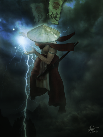 *In Western culture, Raijin is usually known as Raiden (rai (雷, thunder) + den (電, lightning)), and depicted as a tall monk wearing a large straw hat (these hats are used widely throughout Asia to keep off rain), with the power to create storms, thunder, and lightning. The first use of this archetype was an appearance with other Eastern elemental gods in the 1986 film Big Trouble in Little China, though Lei Gong, a similar Chinese god, might have influenced the character in the film.